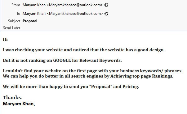Be very wary of SEO companies that contact you out of the blue via email. These companies often purchase email lists or use automated tools to scrape websites for contact information. We’ve shown a typical email here of what these contain.